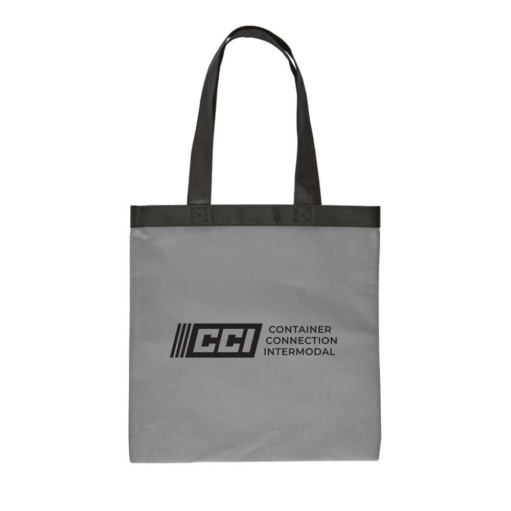 Basic 13” x 14” non-woven polypropylene tote bag with 22"" black handles and top trim.